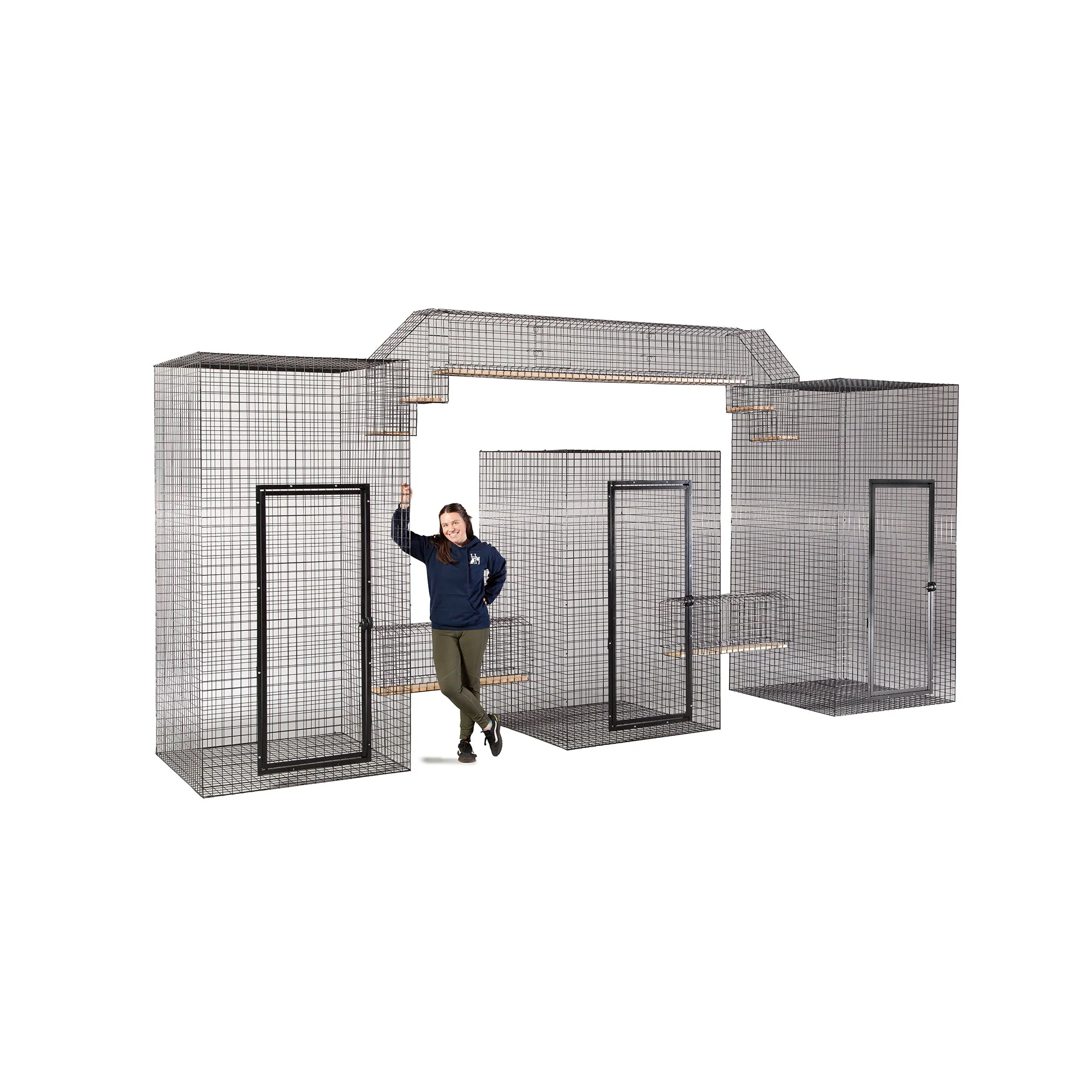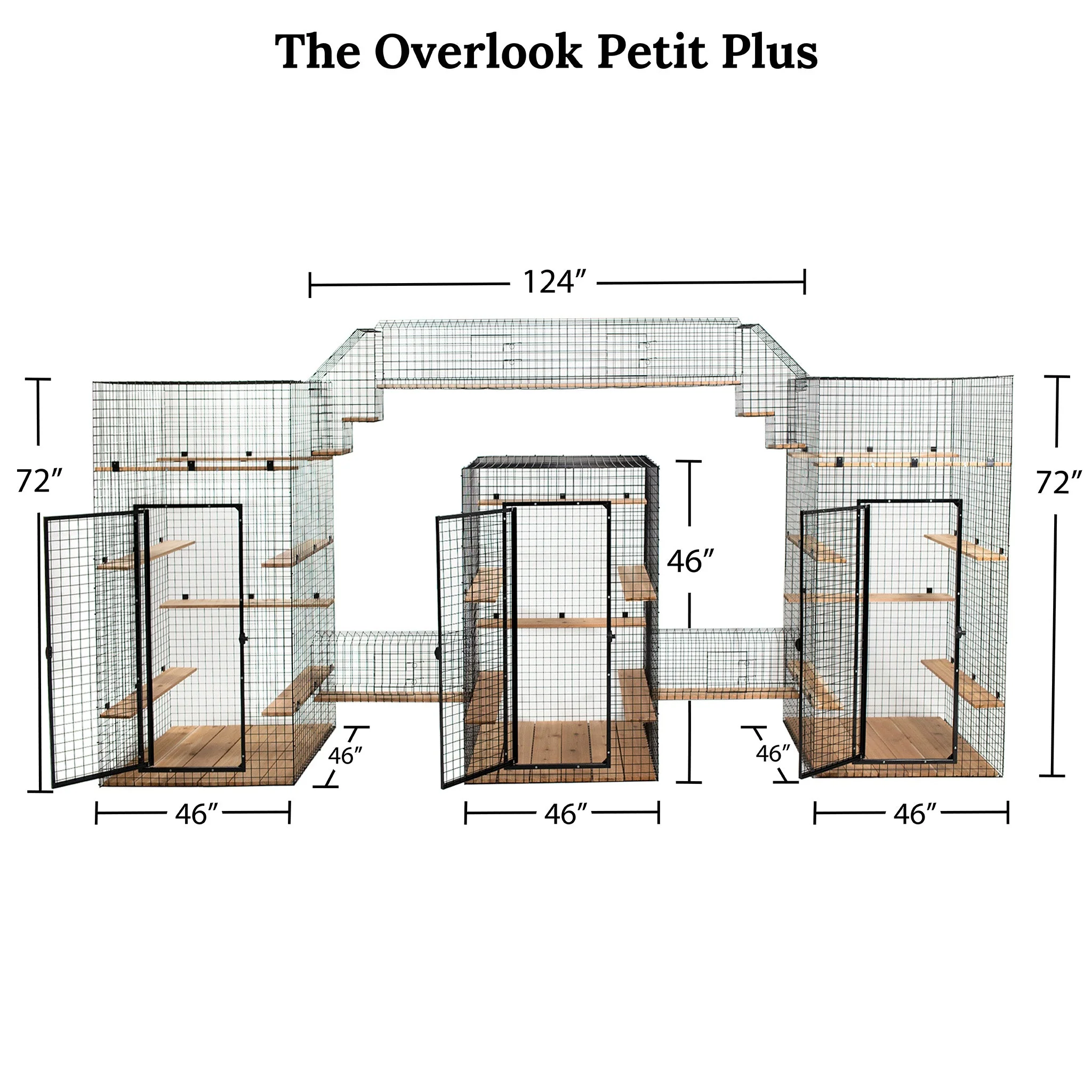 The Petit option comprises three enclosures (two at 72” tall, one at 46” tall) interconnected with tunnels and a long cat bridge. This configuration provides multiple vantage points and spaces for your cats to explore and relax. It is great for households with more than one cat!
